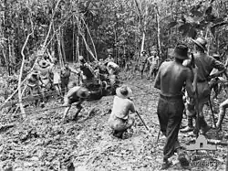 ![]() Troops from the 2/1st Pioneers assist 14th Field Regiment gunners to move a 25-pdr gun up the Kokoda Track, September 1942 | |