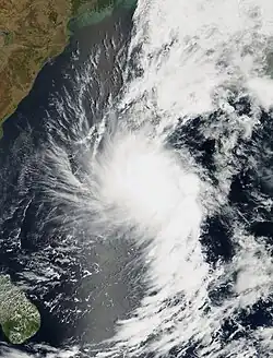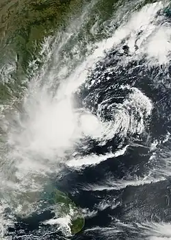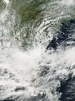 Similar to the previous storm, the active monsoon trough spawned a low-pressure area over the Andaman Sea on October 24. There was a weak center that had good outflow. On October 25, the IMD classified the system as a depression about 925 km (575 mi) southeast of Kolkata. The system moved to the northwest and developed more convection close to the center, although the thunderstorms were intermittent. Turning more to the north, the depression intensified into a deep depression and later cyclonic storm on October 27, reaching peak winds of 65 km/h (40 mph); the JTWC also classified it as Tropical Cyclone 02B. That day, the wind shear increased, although the convection was able to increase over the center and organize into a comma-shaped rainband. Early on October 28, the storm made landfall in southern Bangladesh near Mongla, by which time the wind shear had displaced much of the convection to the northeast. It rapidly weakened over land, degenerating into a remnant low over northern Bangladesh early on October 29.[4][9]