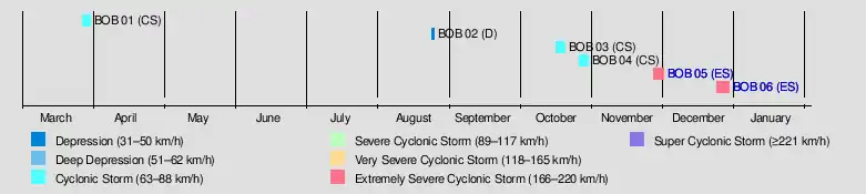 The season was much less active than the devastating 1999 season. Despite near normal water temperatures over the Arabian Sea, no storms developed in that portion of the basin. Convection was also lower than normal across the Bay of Bengal. The main factor against tropical cyclogenesis was persistently unfavorable wind shear. Overall, there were six depressions, five of which intensified into a cyclonic storm, which has maximum sustained winds of at least 65 km/h (40 mph).[4]