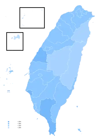 | Kinmen County | 35,808 | 19,991 | 81.81% | 3,543 | 14.50% | 37 | 0.15% | 105 | 0.43% | 759 | 3.11% | 214 | 68.84% | -19,232 |
