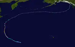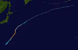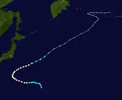 Tropical Depression 09W developed from an area of convection about 1,000 km (620 mi) to the east of Iwo Jima on July 21. Continued consolidation of its convection prompted both the JTWC to classify it as a tropical storm on 18:00 UTC.[27] The JMA followed suit six hours later and named it Kong-rey.[13] By July 23, the JTWC upgraded Kong-rey to a typhoon while the JMA upgraded it to a severe tropical storm.[13][11] A mid-latitude ridge to the east of Japan strengthened, causing Kong-rey to curve and move in a northeastward direction.[27] Kong-rey reached its peak intensity on July 25, then slightly weakened afterwards. At the same time, the JMA had finally upgraded Kong-rey to a typhoon.[13] On July 26, a redevelopment of a small eye caused Kong-rey to reach its second peak intensity for a short period of time. Its peak strength only maxed out to 10-minute sustained winds of 130 km/h (81 mph). Increasing wind shear caused the typhoon to weaken the next day. Kong-rey was downgraded to a tropical storm on 00:00 UTC of July 28.[27] Both agencies issued their final warning later that day when it had become extratropical.[13][11] Its remnants was still tracked until it reached the southwestern Aleutian Islands on August 3.[27]