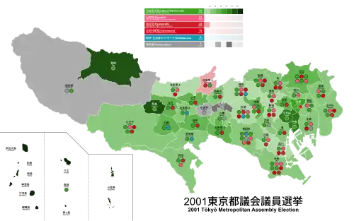 Prefectural elections were held in Tokyo for the city's Metropolitan Assembly on June 24, 2001. The Liberal Democratic Party (LDP) and New Komeito Party secured their positions as ruling parties. Japanese Communist Party (JCP) lost almost half its seats while Democratic Party of Japan (DPJ) saw an increase by ten seats.