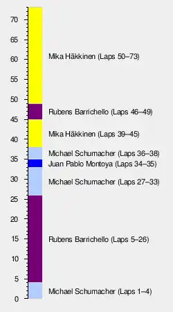 Further back, Button overtook Trulli for eighth while Irvine was passed by Alesi for eleventh.[89] On lap five, Michael Schumacher realized that Barrichello was faster than him because of the latter's two-stop strategy and slowed slightly, letting his teammate by on the inside approaching turn eight at the end of the back straight and into the lead.[18][84][91][92] Barrichello's string of fastest laps allowed him to draw away from the rest of the field and lead by 5.2 seconds on the tenth lap.[89] Heideld attempted to pass Coulthard on the inside into turn one on lap nine.[93] Despite failing to complete the manoevure,[93] Heidfeld battled Coulthard for the next eight laps.[75] Between the 13th and 14th laps, Alesi overtook Benetton teammates Button and Fisichella after braking on the inside into turn one, as the Benetton cars were difficult to drive due to rear tire wear.[37]: 277 [75][88] As the ambient temperature rose, the field became more dispersed by lap 19.[76] As the tires degraded and cars became lighter when their fuel loads reduced,[6][83] Montoya and Ralf Schumacher gained on Michael Schumacher by setting personal fastest laps from around lap 20.[76][90][93] Because the wear and balance on the Williams cars remained consistent, Montoya's performance on the Michelin tires improved with time.[6][82]