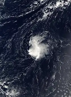 A tropical wave exited Africa on September 1, and after initial development became disorganized. It moved west-northwestward for a week, reorganizing enough by September 7 to be declared Tropical Depression Seven about 1,155 mi (1,859 km) east-southeast of Bermuda.[46] At the time, the depression had persistent convection around a small circulation, and it moved steadily westward due to a ridge to its north.[47] Shortly after forming, strong wind shear diminished the convection and left the center partially exposed.[48] By September 8, there was no remaining thunderstorm activity,[49] and the depression degenerated into a remnant low-pressure area.[50] The storm dissipated shortly after as strong wind shear continued to cause the storm to deteriorate while located 980 mi (1580 mi) southeast of Bermuda. The depression never affected land.[46]