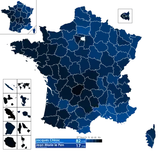 Presidential elections were held in France on 21 April 2002, with a runoff election between the top two candidates, incumbent Jacques Chirac of the Rally for the Republic and Jean-Marie Le Pen of the National Front, on 5 May. This presidential contest attracted a greater than usual amount of international attention because of candidate Le Pen's unexpected appearance in the runoff election.