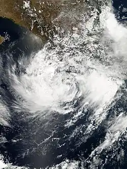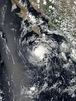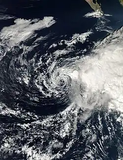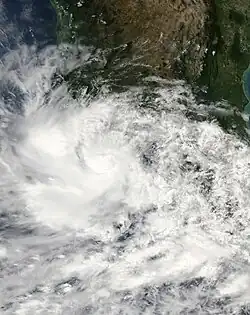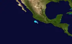 A tropical wave that crossed Central America organized and developed into a tropical depression on June 27.[17] Contrary to forecasts,[18] the depression did not strengthen further because of strong wind shear. By June 29, the depression had become a remnant low, which was observed as a swirl of clouds for a few more days before dissipating.[17]