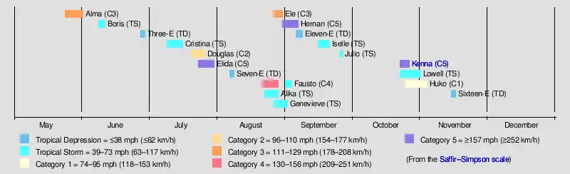 August was active with five systems developing, of which three became hurricanes. Fausto peaked as a strong Category 4 hurricane in the eastern Pacific, before crossing into the central Pacific as a depression. Then, after degenerating into a remnant low well northeast of Hawaii Fausto regenerated into a weak tropical storm at an unusually high latitude. Late that month, Ele became the first of two central Pacific hurricanes to cross the International Date Line into the western Pacific where they became typhoons; the other was Huko in late October.[7] Hernan closed out the month; forming on August 30, it peaked at Category 5 strength two days later, far from land. Activity decreased appreciably in September and October as most of the storms remained weak and were short-lived. The exception was Kenna, which formed on October 22 and peaked as a Category 5 hurricane two days later; it was the strongest hurricane of the season, Kenna was one of two landfalling systems this season, the other being Tropical Storm Julio in September. All casualties and most of the damage incurred during the season was caused by Kenna.[2] No named storms formed during the final few weeks of the season, which effectively came to a close on November 16 when Tropical Depression Sixteen-E, dissipated.