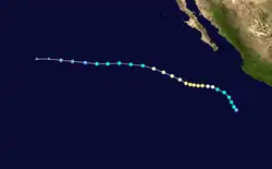 The season officially began on May 15 in Eastern Pacific and on June 1 in Central Pacific; both ended on November 30.[1] In the eastern Pacific, the season saw below average activity in terms of the number of total storms and hurricanes, but about average activity in terms of major hurricanes.[2][3] There were 16 tropical storms in the eastern Pacific Ocean in the season. Of those, eight became hurricanes, of which six became major hurricanes by reaching Category 3 or higher on the Saffir–Simpson scale. Three reached Category 5 intensity,[4] equaling the record set in 1994, and later equaled in 2018.[4][5] Additionally, four tropical depressions formed and dissipated before reaching the intensity of a tropical storm.[6] Three tropical storms formed in the Central Pacific Hurricane Center's area of responsibility, where overall activity was near normal. Two of the storms strengthened into hurricanes, with one of them intensifying into a major hurricane. Two additional systems tracked into the area from the eastern Pacific.[7]