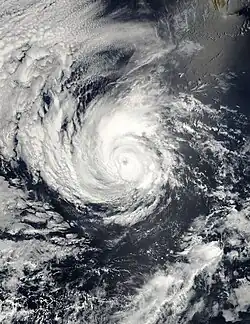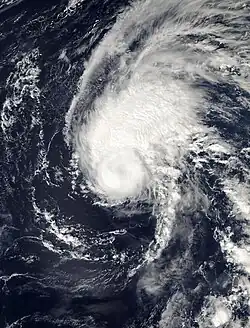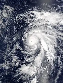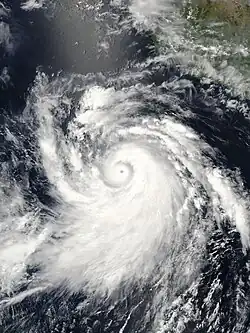 The storm continued to rapidly intensify and gradually developed a banding eye feature and infrared satellite images showed a possible eyewall in the central dense overcast.[34] After six more hours, a small eye had formed and Elida was upgraded to a high-end Category 2 hurricane on the Saffir-Simpson Hurricane Scale with 110 mph (180 km/h) winds on July 24, only eighteen hours after having first been initiated as a 35 mph (56 km/h) tropical depression.[35] Elida continued to rapidly strengthen, breaking the Dvorak estimates and reaching 135 mph (217 km/h) six hours afterward, making it a Category 4 hurricane and resulting in a rare forecast for the hurricane to reach Category 5 intensity.[36] The hurricane, moving at 16 mph (26 km/h), proceeded to make a west-northwestward turn while displaying an eye with an estimated diameter of 11 mi (18 km).[37] On July 25, Elida attained peak winds of 160 mph (260 km/h), making it a Category 5 hurricane. At the time, the NHC assessed a slightly lower peak as a high end Category 4.[38][31] At this time, Elida was observed to have formed concentric eyewalls, but it was not until the hurricane moved over cooler waters that the storm's eyewall replacement cycle was completed.[31] When the MERIS sensor aboard the European Space Agency's satellite Envisat observed and recorded Hurricane Elida at peak intensity, it was the first time that the instrument had observed a hurricane. The sensor was originally designed primarily for recording oceanic biology and water quality as well as land vegetation, clouds, and water vapor.[39]