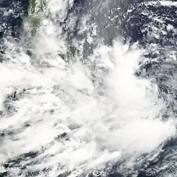On March 15, the JTWC began monitoring a tropical disturbance, and four days later upgraded it to a tropical depression near Palau.[11][21] The next day, both the JMA and PAGASA classified the system as a depression, and PAGASA named it "Caloy".[23] Moving west-northwestward due to a ridge to the north,[11] the depression moved across the Philippine island of Mindanao on March 21 and continued through the archipelago.[21] Owing to strong wind shear, the system never intensified,[11] and the JMA discontinued advisories on March 23 after the system reached the South China Sea.[23] The JTWC maintained the system as a tropical depression until March 25, when a mid-latitude trough absorbed the system off the east coast of Vietnam.[11]