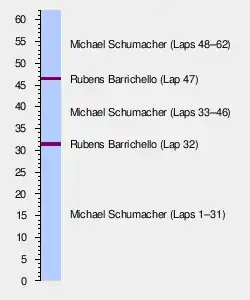 Frentzen retired on the grass on lap 27 after losing fuel rail pressure unexpectedly. Salo retired to the Toyota garage two laps later after losing use of traction control and fourth gear.[67][71] As the race approached halfway, Michael Schumacher led Ralf Schumacher by 17 seconds, and Barrichello was still putting pressure on the lead Williams driver.[62] Räikkönen was the first of the top six to make a pit stop on lap 31. His 10.8-second stop dropped him behind teammate Coulthard.[61][66] Ferrari and Williams were both executing two-stop strategies after converting from one-stop strategies, and they carried fuel in their vehicles in case their plans changed sooner in the race.[63][70] Michael Schumacher made his pit stop from the race lead on lap 31, followed by Ralf Schumacher on the same lap.[69] Barrichello took the lead for one lap and pushed hard to pass Ralf Schumacher before his pit stop on lap 32.[69][70] His 7.4-second stop moved him past Ralf Schumacher.[67] Meanwhile, De La Rosa retired on the side of the track where the pit lane joined the circuit due to a driveshaft failure on the same lap.[66][70]