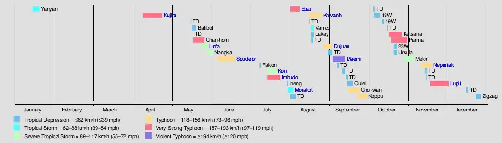 The season began with the formation of Tropical Storm Yanyan on January 15. After its dissipation five days later, no tropical cyclones of at least tropical storm intensity developed over the next two months. This period of inactivity ended with the formation of Typhoon Kujira in mid-April;[12] Kujira was one of the longest lived Pacific storms on record and was the first typhoon with 1-minute sustained winds of at least 240 km/h (150 mph) in April since Typhoon Isa in 1997.[17] Tropical activity was enhanced from May to June, and during this period the JMA monitored four tropical storms,[12] while the PAGASA monitored a fifth storm off the eastern Philippines.[1] Three of the four tropical storms monitored by the JMA approached or hit Japan,[12] including Typhoon Soudelor, which brought heavy rainfall and wind across the Ryukyu Islands and the Korean Peninsula.[18]