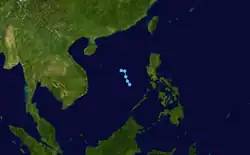Shortly after developing, Kujira caused two fatalities in Pohnpei in addition to minor agricultural and infrastructural damage;[17] similar effects were felt in Guam.[31] Several days later, the typhoon prompted cyclone warnings and other precautionary measures in the Philippines after forecasts indicated the potential for strong winds and rain.[32][33] However, ultimately any effects in the archipelago associated with Kujira remained minimal.[34] The typhoon also prompted warning products in Taiwan,[35] making it the first April typhoon since 1978 to cause such a feat.[17] Unlike in the Philippines, however, Kujira would bring significant rainfall to Taiwan.[36] Effects from the typhoon were most significant in Japan,[37] particularly in the Ryukyu Islands. Strong winds, rain, and waves caused US$230,000 (¥27.8 million) in agricultural damage on Ishigaki Island. One person was killed due to injuries resulting from the waves.[38] In Kyushu, heavy rainfall, peaking at 196 mm (7.7 in) in Ōita Prefecture, was reported.[37] Overall, despite its distance away from land and weak intensity at the time of its sole landfall, Kujira resulted in three fatalities.[17][38]