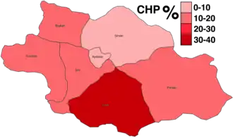 Four parties contested the by-election, as opposed to the 19 that contested the 2002 general election. Similar to general elections, the by-election elected three MPs through a party-list proportional representation system using the D'Hondt method. The parties contesting the election were the Justice and Development Party (AKP), the Republican People's Party (CHP), the Workers' Party (İP) and the Communist Party of Turkey (TKP).[2] The AKP won all three seats up for election with 84.82% of the votes, gaining the two other seats that had been won by the CHP and an independent candidate in November 2002. The CHP came second with 13.79% of the vote and lost their seat despite increasing their vote share since November.