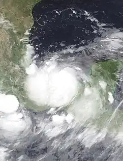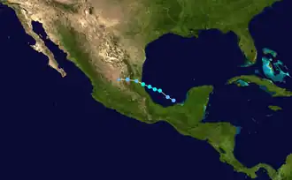Between June 24 and June 27, a tropical wave and weak low-pressure area moved in tandem across Central America and eastern Mexico. The system then reached the Bay of Campeche early on June 28 and quickly organized into a tropical depression that day around 18:00 UTC. Six hours later, at 00:00 UTC on June 29, the depression intensified into Tropical Storm Bret and peaked with sustained winds of 40 mph (64 km/h). Bret moved ashore northeastern Mexico near Tuxpan, Veracruz, around 12:00 UTC, dissipating early on June 30 over San Luis Potosí.[71]