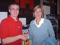 DeVos, a multimillionaire, had developed substantial political contacts with the full participation of his wife, former Michigan Republican Party chair Betsy DeVos, despite which, fully 85% of the DeVos campaign's contributions were from DeVos' inheritance.[16] As the 2006 election approached, the DeVos family was listed among the biggest Republican campaign contributors in Michigan.[17] The DeVos campaign spent $42.5 million, at that time the most spent on a gubernatorial campaign in Michigan history. $35.5 million of that total came from DeVos' personal fortune, and was at that time the most spent personally by a Republican candidate running for governor. The Granholm campaign spent $15.7 million. The combined money spent by both campaigns made this election the most expensive gubernatorial election in Michigan history. As DeVos funded his campaign himself, he was not eligible for public funds.[18]