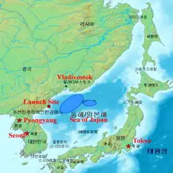 The missiles were launched from the Musudan-ri Missile Test Facility, and all of the missiles reportedly landed in the Sea of Japan, 500–600 kilometers west of the northern Japanese island of Hokkaidō, in international waters about 100 kilometers south of the Russian cities of Vladivostok and Nakhodka.[4] It was also reported that two missiles landed in Russian territorial waters.[5] Only the Taepodong-2 was launched from Musudan-ri. The Scuds and Nodongs were launched from Gitdaeryung, Anbyun, and Kangwon-do.[4] (Also spelled as Kitdaeryung, as in the table of launch in next section)