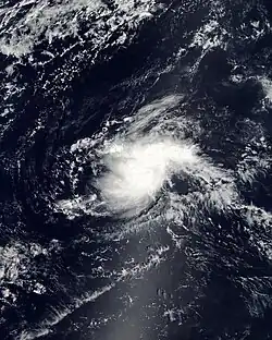 The first storm of the year had its genesis from a tropical wave that crossed Central America and entered the East Pacific on May 21. The system interacted with a trough near the Gulf of Tehuantepec, causing thunderstorms to increase. A large low-pressure area formed on May 25 south of Mexico, which organized slowly due to wind shear in the region. Early on May 27, the NHC designated the system as Tropical Depression One-E about 190 mi (305 km) south of Acapulco.[14] The nascent storm moved little, and the wind shear displaced the center west of the convection.[15] Late on May 27, the NHC upgraded the depression to Tropical Storm Aletta.[14] While named tropical cyclones in May are infrequent events, Aletta marked the seventh consecutive year to have a named cyclone form in May.[16] The storm drifted for several days off the southern coast of Mexico. The NHC estimated peak winds of 45 mph (70 km/h) on May 28,[14] as the storm presented an elongated cloud structure.[17] Increased wind shear and dry air caused weakening on May 29, and Aletta weakened into a tropical depression. Drifting westward, the system became a remnant low on May 31, and dissipated soon afterward.[14]