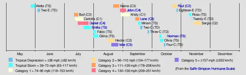 Seasonal activity began on May 27, when Tropical Storm Aletta formed off the southwest coast of Mexico. No storms formed in June, though the season became active in July when five named storms developed, including Hurricane Daniel which was the second strongest storm of the season, as well as Tropical Storm Emilia. During August, Hurricanes Ioke and John formed, as well as four other storms. The strongest storm of the season was Hurricane Ioke, which reached Category 5 status on the Saffir–Simpson scale in the central Pacific Ocean; Ioke passed near Johnston Atoll and later Wake Island, where it caused heavy damage but no deaths. The deadliest storm of the season was Hurricane John, which killed six people after striking the Baja California Peninsula, and the costliest storm was Hurricane Lane, which caused $203 million in damage in southwestern Mexico (2006 USD, $317 million 2025 USD). Damage across the basin reached $355.1 million (2006 USD), while 14 people were killed by the various storms.