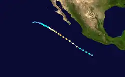 The origins of Emilia were from a tropical wave that developed into a tropical depression on July 21, a short distance off the coast of Acapulco. It moved generally north-northwestward, reaching tropical storm status on July 22 and passing about 175 mi (280 km) southwest of Manzanillo, Colima.[43] An eyewall began to form that day,[44] and Emilia reached peak winds of 65 mph (105 km/h).[43] It briefly weakened due to wind shear, although restrengthening occurred as the storm turned toward the Baja California peninsula. On July 26, Emilia again reached peak winds of 65 mph (105 km/h), and shortly thereafter it passed about 60 mi (95 km) southwest of the southern tip of Baja California. It weakened as it turned into cooler waters, first to tropical depression status on July 27 and then to a convective-less remnant low on July 28. The remnants dissipated on July 31 about 495 mi (795 km) west-southwest of San Diego, California.[43]