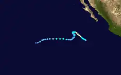 As Ileana was heading north along the Mexican coastline, slight rainfall was recorded along the coast,[66] which caused some flooding in Nayarit, Jalisco, Colima, Michoacán, and Baja California Sur.[67] High surf killed a man near Cabo San Lucas, despite warnings not to swim in the ocean.[68] Despite forecasts of further intensification to Category 4 status,[69] Ileana began weakening due to cooler waters. The thunderstorms waned, and the storm slowed its forward motion.[64][70] On August 26, Ileana weakened to tropical storm status as convection decreased markedly. The next day, the storm deteriorated to tropical depression status, and later a remnant low after being devoid of thunderstorms. The low continued slowly westward, dissipating on August 29 about 830 mi (1,335 km) west-northwest of Cabo San Lucas.[64]