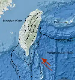 Taiwan lies in a zone of complex interaction between the Philippine Sea plate (PSP) and the Eurasian plate (EP). To the north, the PSP is subducting beneath the EP along the line of the Ryukyu Trench, forming the Ryukyu Volcanic Arc. To the south, in contrast, the EP is subducting beneath the PSP along the line of the Manila Trench, forming the Luzon Volcanic Arc. At its northern end the Luzon Arc is colliding with the continental margin of the Eurasian plate as the thicker and more buoyant crust enters the subduction zone. This zone of collision is propagating southwards and the Hengchun Peninsula marks the early stages of this process.[4]