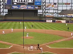 However, their home opener, as well as the remainder of a four-game series with the Seattle Mariners, was postponed due to heavy snow. After a discussion about a possible relocation of the following series between the Indians and the Angels to Anaheim,[3] the Indians decided to relocate the three-game series to Miller Park in Milwaukee.[4] The three-game series averaged a surprising 17,498 fans in attendance, and featured several homages to the fact that the film Major League was shot in Milwaukee, including closer Joe Borowski entering the game to "Wild Thing".