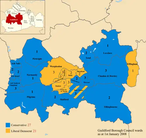 - geographically the 2007 election saw Conservatives pick up their seats towards the south east of Guildford. The Liberal Democrats picked up their seats towards the north and west of Guildford town.