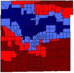 ![]() Voting by party by neighborhood. The darkest blue shade represents more than 60% of votes were for Peterson, the lighter blue shade represents more than 50% for Peterson. The darkest red shade represents more than 60% of votes were for Ballard, the lighter red shade represents more than 50% for Ballard. | |||||||||||||||||