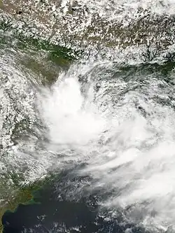 On June 28, an area of disturbed weather in the Bay of Bengal that had persisted as a well-marked low pressure area for two days became more organised.[42] The India Meteorological Department (IMD) noted the formation of a depression around 0000 UTC (5:30 am IST) southeast of Puri, Orissa, India. The IMD also stated that the system intensified into a deep depression three hours later whilst remaining "practically stationary".[43] The Joint Typhoon Warning Center (JTWC) issued a Tropical Cyclone Formation Alert shortly after, noting that observations from the eastern coast of India had recorded falls in pressure corresponding with the system's development. Furthermore, an upper-level anticyclone had formed over the disturbance, which would maintain the favourable wind shear conditions.[44] The JTWC initiated advisories later that day,[45] as the depression moved northwest towards the Orissa coast.[46] The depression made landfall near Puri early on June 29.[47] The JTWC then issued its last advisory later that day, as the system moved inland.[48] Early on June 30, with the system centred over Madhya Pradesh and Chhattisgarh, the IMD downgraded the system to a depression,[49] and discontinued advisories 6 hours later.[49]