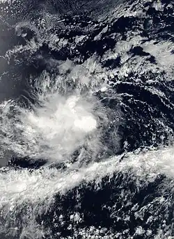 On June 21, a tropical wave emerged off the western coast of Africa. It entered the eastern Pacific on July 10, and shower and thunderstorm activity began to increase a day later as a result. Tracking westward, the wave gradually became better organized; by 1200 UTC on July 14, the disturbance acquired enough organization to be upgraded to a tropical depression.[23] Within an environment of moderate wind shear, the low-level center quickly became poorly defined as convection dissipated.[24] Turning west-northwest on July 15, the depression entered cooler waters and an increasingly stable airmass, causing the system to degenerate into a remnant low by 0000 UTC the following day. The remnant low dissipated a few hours later.[23]