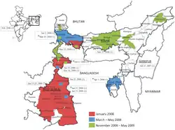 The first outbreak in 2008 began in January, with confirmation from the World Organisation for Animal Health established through lab tests on 15 January 2008.[3] This outbreak continued through 31 October 2008.[4] A second outbreak began in Assam in November 2008, confirmed through lab tests on 27 November 2008.[5] This outbreak continued through 27 October 2009.[6] A third wave occurred from 15 January 2010 through 2 June 2010.[7] A fourth wave followed in Assam in February 2011, confirmed through lab tests on 16 February.[8] That outbreak did not reach West Bengal.[9] A fifth outbreak began in August 2011, once again in Assam, confirmed through lab tests on 8 September 2011.[10] and continued through 28 December 2011; the district of Nadia was affected.[11]
