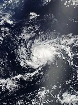 A tropical wave, indistinguishable in the Atlantic basin, crossed the coastline of Central America on July 8 and organized into a tropical depression three days later around 18:00 UTC. With a mid-level ridge extending from the Gulf of Mexico into western Mexico, the newly formed cyclone moved west-northwest within an increasingly favorable environment, intensifying into Tropical Storm Elida by 06:00 UTC on July 12 and becoming the season's first hurricane around 12:00 UTC on July 14. An abrupt increase in wind shear briefly weakened the storm the next day, but by 18:00 UTC on July 16,[20] the formation of an eye within Elida's round central dense overcast showcased its peak as a Category 2 hurricane with winds of 105 mph (170 km/h).[21] The system then tracked into cooler waters and stronger upper-level winds, causing it to fall below hurricane intensity by 06:00 UTC on July 18 and degenerate to a remnant low early the next morning, although it maintained a well-defined circulation. The low ultimately dissipated well east-southeast of Hawaii by 00:00 UTC on July 22.[20]