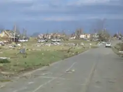 The tornado then tracked into Trousdale County and passed through rural areas to the northwest of Hartsville, weakening slightly to high-end EF2 strength. Frame homes were damaged or destroyed, vehicles were tossed and damaged, numerous trees were snapped and denuded, and mobile homes were obliterated with debris and insulation strewn long distances downwind. Ten homes were destroyed, and 23 homes had major damage along this segment of the path. As a result of the tornado, a major fire occurred as a natural gas plant was ripped apart by the tornado in the southwestern portion of the county. The area was evacuated and no one was injured at the plant. Two people were killed at a home along US 231, and five other people were injured in the county.[65][66][4][67] Crossing into Macon County, the tornado regained EF3 intensity as it struck the western and northern sections of Lafayette, resulting in widespread, major destruction in the area. Numerous homes and several churches were destroyed in Lafayette, with several leveled to the ground. An auto sales business in town sustained heavy damage as well. Surveyors observed major damage to a large, expensive brick home that was built unanchored on a very weak, unreinforced cinder block foundation. The house shifted off the foundation during the tornado, causing walls to buckle and collapse. 170 homes were destroyed, and 9 homes had major damage in the Lafayette area. Thirteen people were killed in and around town, and 44 others were injured. President George W. Bush toured the Macon County destruction on February 8 and promised relief to individuals.[68] The logging industry in Macon County was hit hard, with about a million dollars worth of trees destroyed. Debris from Lafayette was found as far north as Sano, Kentucky, in Adair County, approximately 70 miles (113 km) to the northeast.[69] Sixteen thousand TVA electricity customers in Macon and Trousdale Counties lost power, some of whom did not have their service restored for a week.[70][71] Macon County schools were closed until February 19.[72][73][74][75] In total, roughly 260 houses in the three Tennessee counties were destroyed, and damage amounts were estimated at $78 million in Macon County alone.[76][77]