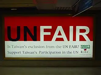 The first referendum question, supported by the Democratic Progressive Party (DPP) of President Chen Shui-bian,[2] asked whether voters agree that the government should seek United Nations membership under the name "Taiwan".[1] The second referendum question, supported by the Kuomintang (KMT), which on the same day won the presidential election,[2] asked whether voters supported "our nation" seeking to "return" to the United Nations and join other international organisations under "flexible and practical strategies", including joining as "Republic of China", "Taiwan", or any other name that aids success and national dignity.[1]