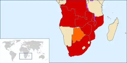 The spread of cholera to Zimbabwe's other neighbouring countries was initially slower than in South Africa, with one death recorded in Kafue District in Zambia and none in Botswana or Namibia by 9 December 2008.[31] In 2009, cases increased, with 4,354 cases and 55 deaths reported by 10 February 2009 in Zambia and 1,596 cases and 14 deaths in Katanga, the southernmost province of the DR Congo.[68] In Mozambique, cholera spread to 10 out of 11 provinces,[68] with a total of 9,533 cases by 1 Jan to 1 Mar 2009 and 119 deaths by 17 March.[69] Four health workers also died in a mob attack, blamed on "misinformation and misunderstanding in efforts to combat cholera",[70] and 12 of the prisoners from the incident died in jail.[69] In Malawi 104 deaths were recorded since January, making it the worst outbreak since 2001–02 where 960 people died.[71] Kenya, Somalia, Tanzania, DRC, and Ghana have had unrelated cholera outbreaks with between 10 and 100 deaths in 2009 as of February.[68]