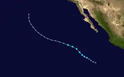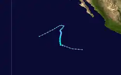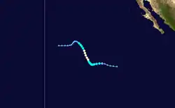 A tropical wave exited the western coast of Africa on June 19, which moved westward across the Atlantic without development. By June 29, the wave crossed Central America into the eastern Pacific. Thunderstorms increased over the next several days, which organized into curved rainbands around a developing low-pressure area on July 4. Following further organization, the system developed into a tropical depression on July 6, located roughly 435 miles (700 kilometres) south of Cabo San Lucas, Mexico. Soon after, it strengthened into Tropical Storm Blanca.[25] Operationally, the NHC classified the system immediately as a tropical storm. At that time, Blanca developed an eye-feature, though it was not expected to develop into a hurricane.[26] Steered by a ridge to the north, the storm moved west-northwestward throughout its existence.[25] Early on July 7, Blanca attained peak winds of 50 mph (80 km/h) and a barometric pressure of 998 mbar (hPa; 29.47 inHg).[25] The storm's convection developed into a central dense overcast over the center,[27] which soon began deteriorating, with cloud tops warming and convection shrinking.[28] By late on July 7, the center became devoid of shower and thunderstorm activity,[29] with only intermittent convection.[30] On July 8, Blanca weakened into a tropical depression, and the next day it degenerated into a remnant low. Although no longer a tropical cyclone, the remnants of Blanca maintained a well-defined low pressure center as it continued its northwesterly movement. Early on July 11, the system turned northward and gradually weakened. By the following day, Blanca had dissipated over open waters.[25]