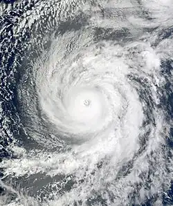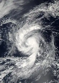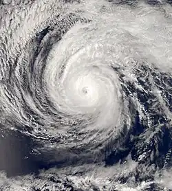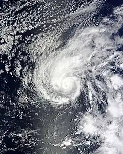 Hurricane Guillermo formed on August 12 from a broad area of low pressure nearly 700 miles (1,100 km) SW of Baja California. The system developed a good series of banding features and convection, and as a result, in the afternoon later that day, it strengthened into a tropical storm, the seventh in the eastern Pacific that year. On August 14, it strengthened to become the fourth hurricane of the season, concurrent to the development of a good, banding type eye. That afternoon, Guillermo strengthened to a Category 2 hurricane with maximum winds increasing to 100 mph (160 km/h). Early on August 15, Guillermo intensified to become the second major hurricane of the season, as it was upgraded by the NHC to a Category 3 hurricane, with maximum winds increasing to 125 mph (201 km/h). On August 16 it crossed into the Central Pacific basin as a Category 1 hurricane, and then quickly weakened to a tropical storm thereafter due to very high wind shear. Despite over very strong as high as 45 mph (72 km/h) of shear, Guillermo survived as a weak tropical storm for a further 3 days before weakening to a depression and degenerating to a remnant low on August 19, near the West Coast. However, the remnants continued to curve towards the northeast for the next several days, before finally dissipating on August 23.[47]