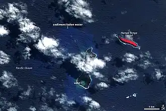 The 2009 Tonga undersea volcanic eruption began on 16 March 2009,[5] near the island of Hunga Tonga, approximately 62 kilometres (39 mi) from the Tongan capital of Nukuʻalofa.[6] The volcano is in a highly active volcanic region that represents a portion of the Pacific Ring of Fire. It is estimated that there are up to 36 undersea volcanoes clustered together in the area.[7]