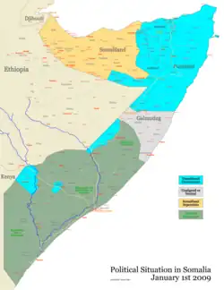 The 2009 timeline of events in the Somalia War (2006–2009) during January 2009 is set out below. From the beginning of February the timeline of events in the Somali Civil War (2009–present) is set out following the conclusion of the previous phase of the civil war.