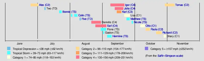 The beginning of the Atlantic season featured Alex, the first hurricane observed in June since Hurricane Allison in 1995.[31] One tropical storm, Bonnie, and a tropical depression formed in the month of July.[32] August featured five cyclones – a tropical depression, tropical storms Colin and Fiona, as well as hurricanes Danielle and Earl (both of which further intensified into major hurricanes).[33] September, the peak period of the Atlantic hurricane season, was its most active month, featuring eight tropical cyclones: tropical storms Gaston, Hermine, Matthew, and Nicole, as well as hurricanes Igor, Julia, Karl, and Lisa. This put the season into a tie with 2002 and 2007 for the most tropical storms to develop in September, a record that stood until it was surpassed in 2020.[34] Igor attained peak winds of 155 mph (250 km/h) on September 15, cementing its status as the most intense storm of the season.[35] Well above-average activity continued into October, with the formation of hurricanes Otto, Paula, Richard, Shary, and Tomas, one hurricane short of the monthly record set in 1870.[36] Tomas persisted into the subsequent month before dissipating on November 7, heralding the end of the season's tropical cyclone activity.[37]