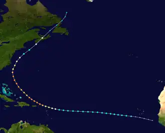 The interaction of a vigorous tropical wave and a disturbance within the Intertropical Convergence Zone led to the formation of a tropical depression about 520 mi (835 km) west-southwest of Cabo Verde by 18:00 UTC on August 21. Steered by a ridge to its north, the depression steadily organized as it moved west-northwest, intensifying into Tropical Storm Danielle by 06:00 UTC on August 22 and attaining hurricane intensity the following day. Influenced by moderate wind shear initially, Danielle maintained its status as a minimal hurricane for several days. Early on August 26, however, a more conducive environment led to rapid intensification, and by 18:00 UTC the next day, the storm attained its peak intensity as a Category 4 hurricane with winds of 130 mph (210 km/h). Danielle began to round the western periphery of the steering ridge after peak intensity, curving northeast as it began an eyewall replacement cycle. The inner core change, combined with progressively cooler waters, resulted in the system weakening to a tropical storm by 18:00 UTC on August 30 and degenerating into a remnant low six hours later. The low became extratropical on August 31 maintained distinct until dissipating well east-southeast of Greenland on September 3.[80]