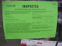 Access was restricted to over 350 homes in the town of Kaiapoi, of which about 100 were deemed unsafe.[83] Some 22 commercial properties were deemed unsafe. According to Ron Keating, Mayor of Waimakariri District, the town "will never be the same again".[84] As noted above, damage to buried pipes may have allowed sewage to contaminate the residential water supply, and residents were warned to boil tap water before using it for brushing teeth, drinking, and washing or cooking food. A boil water notice for most of Selwyn District was lifted on 9 September.[85] E. coli had been found in a water sample from Kaiapoi,[86] and a boil water notice remained in effect for parts of Waimakariri District[87][88] until 19 September.