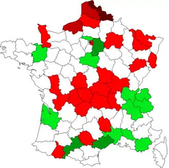 The Constitutional Council of France approved the redistricting of electoral boundaries in February 2010 to reflect France's changing demographics. This was the twelfth redistricting to have taken place. The population ratio between the most populated and least populated constituencies was reduced from the 1986 redistricting results of 1:3.6 to 1:2.[1] In effect, the number of seats increased in areas held by the centre-right coalition led by Union for a Popular Movement at the expense of the Socialist-led centre-left coalition.[2] The 2010 redistricting process not only brought down the rule of two deputies per department to one, it also created eleven constituencies for French residents overseas.