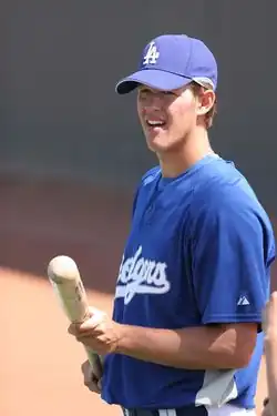 After playing .500 ball in April, the Dodgers were shut out by the Padres to start the month of May 7–0.[68] The Dodgers opened a series with the Cubs on May 2 with a 5–2 victory as doubles by Uribe, Barajas and Sands led the Dodgers offense in support of starter Clayton Kershaw.[69] Two walks in the ninth inning by Jonathan Broxton doomed the Dodgers the following day as they lost 4–1, despite seven strong innings from starter Chad Billingsley, who only allowed one run.[70] Andre Ethier extended his hitting streak to 29 games, and tied Zack Wheat for second place on the Dodgers franchise list.[71] The Dodgers dropped the final game of the homestand 5–1 to the Cubs as Ethier sat out the game due to a sore elbow.[72]
