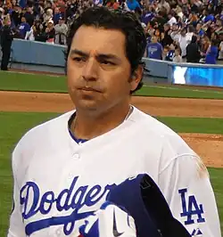 On October 19, the Dodgers announced that they had re-signed starting pitcher Ted Lilly to a three-year contract.[14] On November 4, Jay Gibbons re-signed with the Dodgers for one-year.[15] On November 15, the Dodgers re-signed starting pitcher Hiroki Kuroda to a one-year, $12 million, contract.[16] On November 19, the Dodgers signed minor league catcher Héctor Giménez and added him to their 40-man roster.[17] On November 26, the Dodgers completed their rebuilding of the starting rotation by signing veteran pitcher Jon Garland.[18] On November 30, the Dodgers signed veteran infielder Juan Uribe to a three-year contract, intending to make him the new second baseman.[19] Soon afterward, the Dodgers traded incumbent second baseman Ryan Theriot to the St. Louis Cardinals for relief pitcher Blake Hawksworth.[20] On December 3, one day after releasing veteran Russell Martin, the Dodgers re-signed Catcher Rod Barajas to a one-year deal.[21] Soon afterward, on December 9, the Dodgers finalized a deal to bring back pitcher Vicente Padilla with a one-year contract. Padilla was slated to compete with Garland for the fifth starter spot, and also to possibly pitch out of the bullpen.[22] On December 11, the Dodgers signed outfielder Tony Gwynn Jr. to a one-year deal.[23] On December 14, the Dodgers signed catcher Dioner Navarro to a contract, to compete with Barajas and A. J. Ellis for time behind the plate.[24] The Dodgers added to the relief corps on December 16 by signing right-handed pitcher Matt Guerrier to a three-year contract.[25] The Dodgers signed outfielder Marcus Thames on January 18.[26]