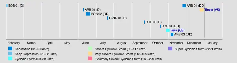 Depression ARB 01 formed in early June near India, before Deep Depression BOB 02 formed a few days later. Land Depression 01 formed on July 22, and dissipated a day later. Depression BOB 03 formed on September 22, and soon made landfall on India. Depression BOB 03 dissipated the next day, on September 23. October was a much more active month, as Deep Depression BOB 04 and Deep Depression ARB 02 both formed, during this period of time. Then Cyclonic Storm Keila formed in November and came ashore in Oman, before Depression ARB03 formed and dissipated near the Oman coast.