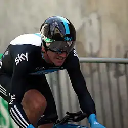 Appollonio took his first victory as a professional during June's Tour de Luxembourg, winning a bunch sprint into Roost.[56] A fifth-place finish the following day, on the final stage, ensured that Appollonio won the points classification, taking the jersey from Team Katusha rider Denis Galimzyanov.[57] Consistent finishing from Wiggins at the Critérium du Dauphiné earned the team their first overall race win at World Tour level. After finishing third in the opening prologue, Wiggins placed second behind Tony Martin (HTC–Highroad) on the third stage time trial, held over the course that would later be used for the penultimate day time-trial of the Tour de France, to take the overall lead by over a minute from nearest challenger, BMC Racing Team's Cadel Evans.[58] Wiggins took sixth-place finishes on stages 5 and 6, and with a tenth place on the final stage, secured the overall win by 86 seconds ahead of Evans.[59] Boasson Hagen also added World Tour points with third behind Wiggins in the time trial, and second to HTC–Highroad rider John Degenkolb on stage 4.[60]