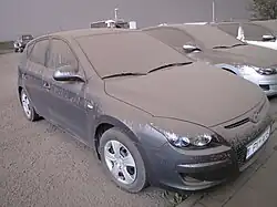 Ash-covered cars at Foss Hotel Skaftafell