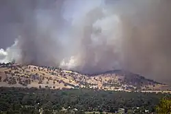 In the hours after midday the fire spotted across John Renshaw Parkway and breached the containment line, burning with flames of up to 33 m (108 ft) and impacting upon the Warrumbungle Visitors Centre, where a number of New South Wales Rural Fire Service and NSW National Parks & Wildlife Service employees were sheltering. By mid-afternoon, the fire was spreading downwind at a rate of 3.7 km/h (2.3 mph) and the NSW Police commenced evacuations to the east of the fire, including at Siding Spring Observatory. The observatory was impacted by the fire in the late afternoon, causing the destruction of three buildings in the complex; 'The Lodge' accommodation used by visiting researchers, the Director's Cottage and the Fire Station.[46][47] Throughout the evening a 14 km (8.7 mi) high pyrocumulonimbus cloud formed above the blaze, creating unpredictable winds, intense spotting and other extreme meteorological conditions; the fire burned to the east, along Timor Rd., burning to within 13 km (8.1 mi) of Coonabarabran township.[19] A southerly wind change passed through the fire ground some time after 18:00 AEDT, causing hot ash and embers to fall in Baradine, 50 km (31 mi) north of Coonabarabran, throughout the night and prompting the Baradine local hospital to secure the windows with damp towels to prevent the entry of smoke and ash.[19]